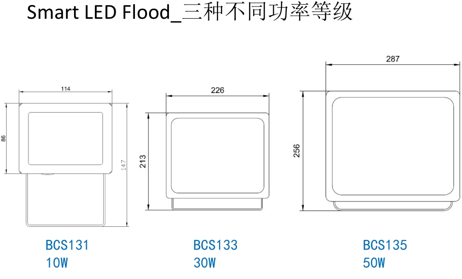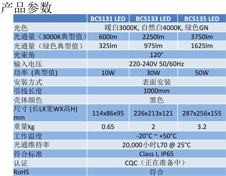 產(chǎn)品特點(diǎn)? 單色泛光燈:暖白WW,中性白NW,綠色GN? 三種不同的流明輸出:BCS131/133/135?適用不同的照明應(yīng)用? 光效高達(dá)75lm/W?高效節(jié)能? 220VAC輸入,燈具帶引出線?安裝便利? 20,000小時(shí)L70?系統(tǒng)壽命長(zhǎng),確保長(zhǎng)期穩(wěn)定運(yùn)行? IP65?滿足戶外安裝使用? ON/OFF僅開(kāi)關(guān)功能